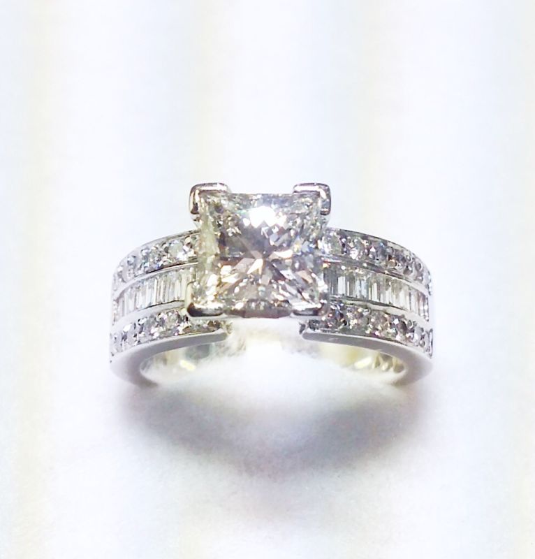 Approx 2.07ct princess cut diamond & mixed cut pave diamonds solitaire ring. Colour I-J, clarity SI assessed. Platinum. New replacement value £19,500