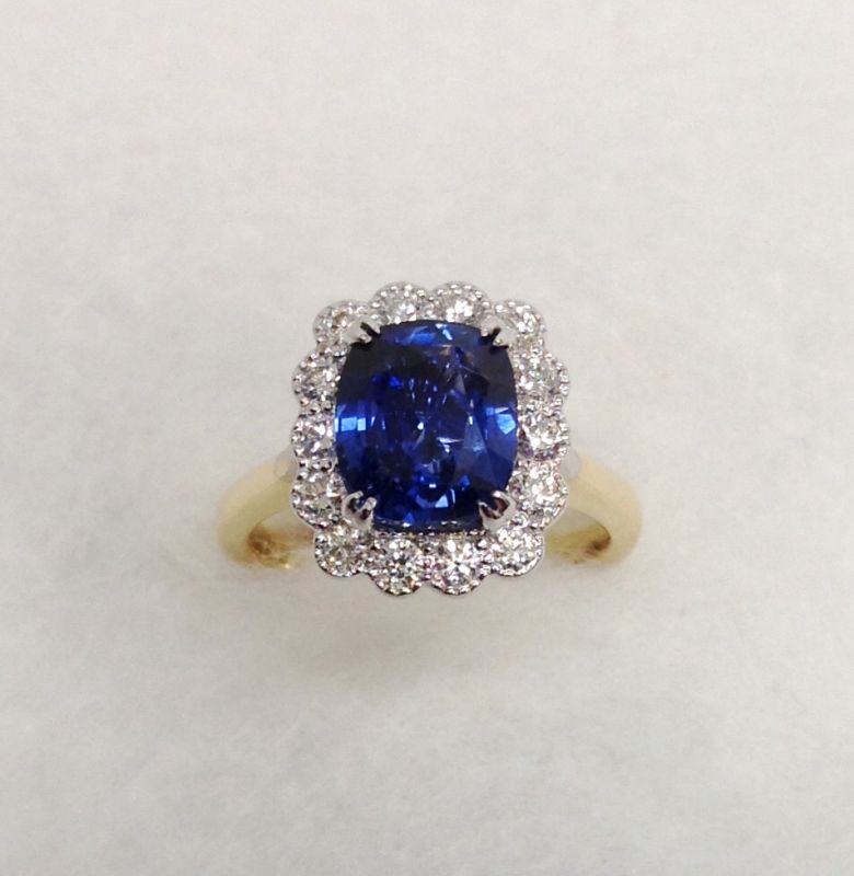 REDUCED A stunning example of an unheated natural sapphire with round brilliant diamond cluster ring. Has Gem & Pearl Laboratory report certificating unheated, 2.54ct cushion cut sapphire. Total diamond weight approx 0.40ct. 18ct yellow & white gold. New replacement value £9,500 Previously priced at £5,999